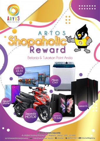 Pusat perbelanjaan terbesar di Magelang, Artos Mall, kembali memberikan kejutan dan benefit yang menarik untuk para customer setianya yaitu program belanja Artos Shopaholic Reward. Berbeda dari Tahun sebelumnnya, program belanja Artos Shopaholic Reward yang menggantikan Artos Histeria Belanja ke-8 ini, menawarkan banyak hadiah bernilai puluhan juta rupiah.